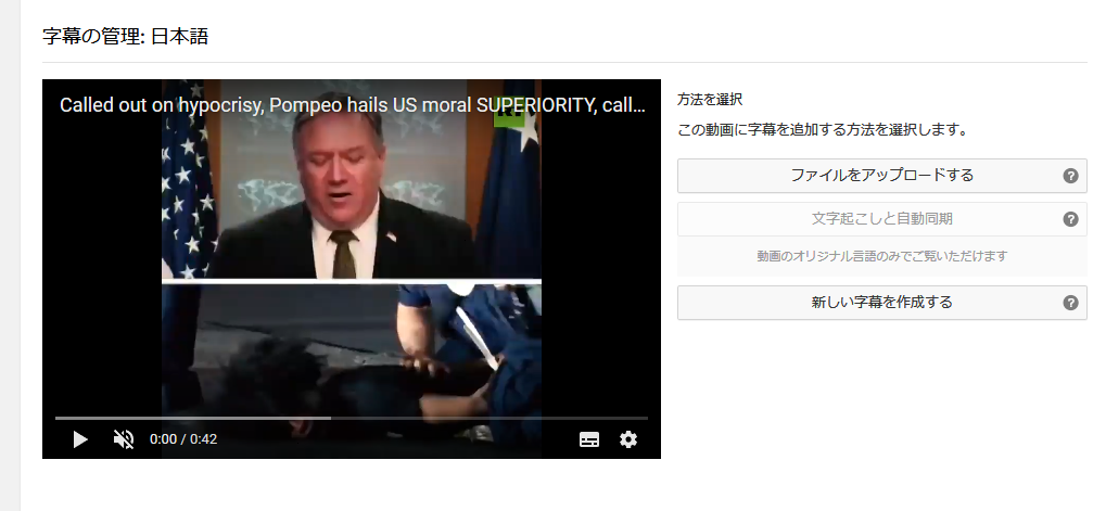 既にSBVあるいはSRT形式の字幕ファイルがある場合には、「ファイルをアップロードする」でアップロードしてしまえば良いです。そうでない場合は「新しい字幕を作成する」を選択します。
