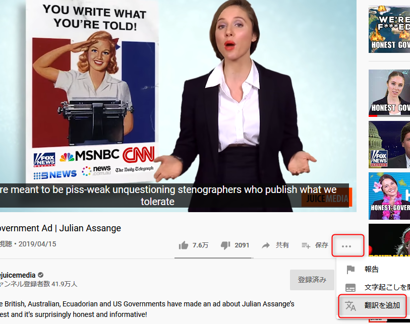 この方法で日本語字幕を付けたものが以下です。アップした本人の動画に追加してもらってます。