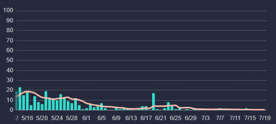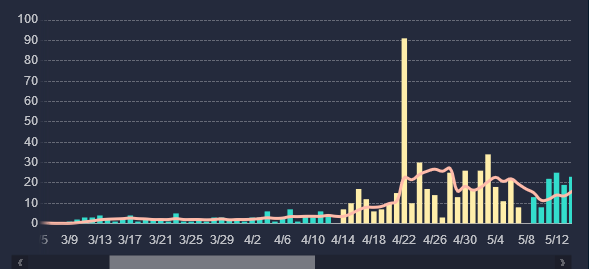 日本については、東洋経済の新型コロナウイルス国内感染の状況によれば(というのも、厚労省がこのような見やすいグラフを出してないからですが。わざとでしょうね)、以下です。