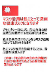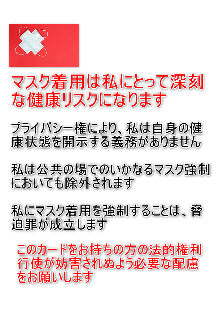 ともあれ、マスクを着けることは、連中の目論見にまんまとはまることです。服従させ相互監視させると。これを破るには、マスクを着けないことです。とても簡単です。