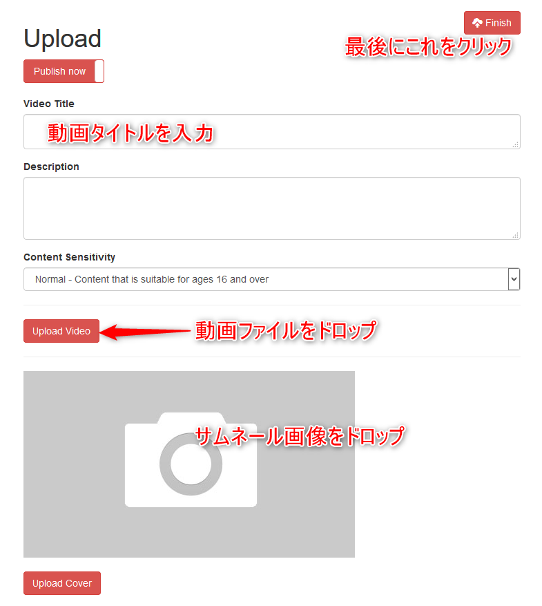 ※先にも書きましたが、ファイル名が日本語の場合、正常にアップされたように見えても、最後のFinishボタンをクリックすると「動画がアップされてないよ」といったメッセージが出ることがあります。