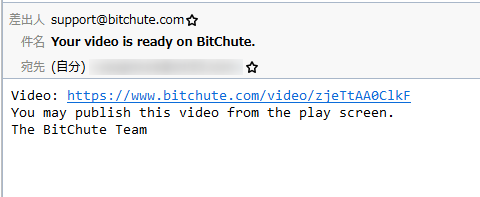 処理が終了すれば、同じURLで動画が見れるようになります。デフォルトの設定では、処理終了すると、登録されたメアドに以下のようなメッセージが来るので、チェックしまくらなくてもわかります。実際にひどい場合は24時間かかります。