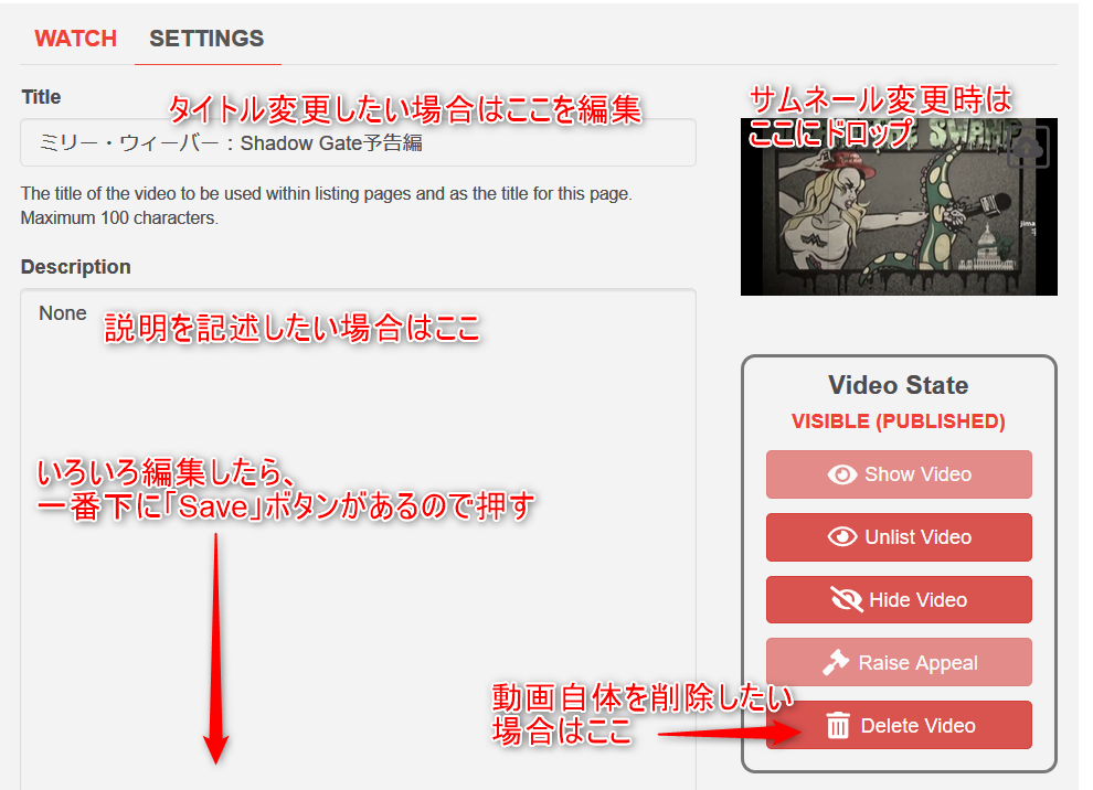 アップした後では動画そのものは変更できませんが、タイトルや説明、サムネールは変更可能です。