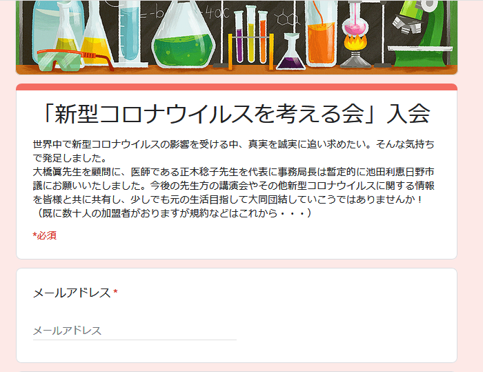 大橋眞先生を顧問に、医師である正木稔子先生を代表に事務局長は暫定的に池田利恵日野市議にお願いいたしました。今後大橋先生を中心とする講演会やその他、新型コロナウイルスに関する情報を皆様と共に共有し、少しでも元の生活目指して参りたいと存じます。また、親しい方々にもお誘いください