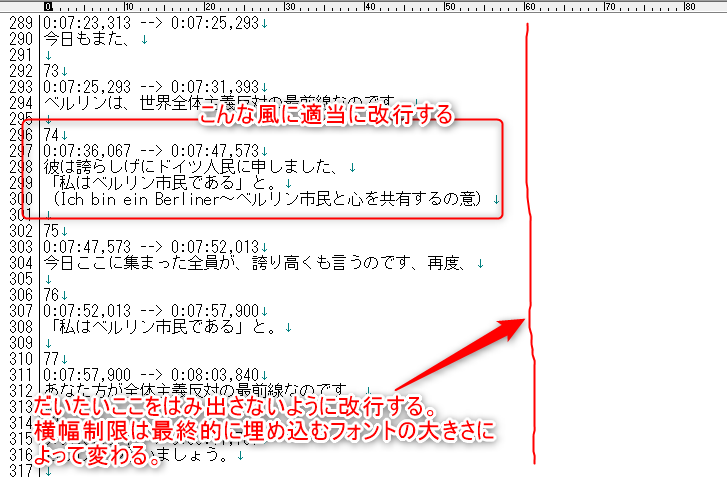 英語の場合には、動画変換マスターが適当に改行してくれるのですが、分かち書きをしない日本語の場合、一行が長すぎると、そのままでは左右にはみ出す可能性があります。このため、適当に改行をいれます。一行をどの程度の文字数にするかは、後で選択する「フォントの大きさ」でも変わってきます。私の場合はおおよそ60か70にしています。