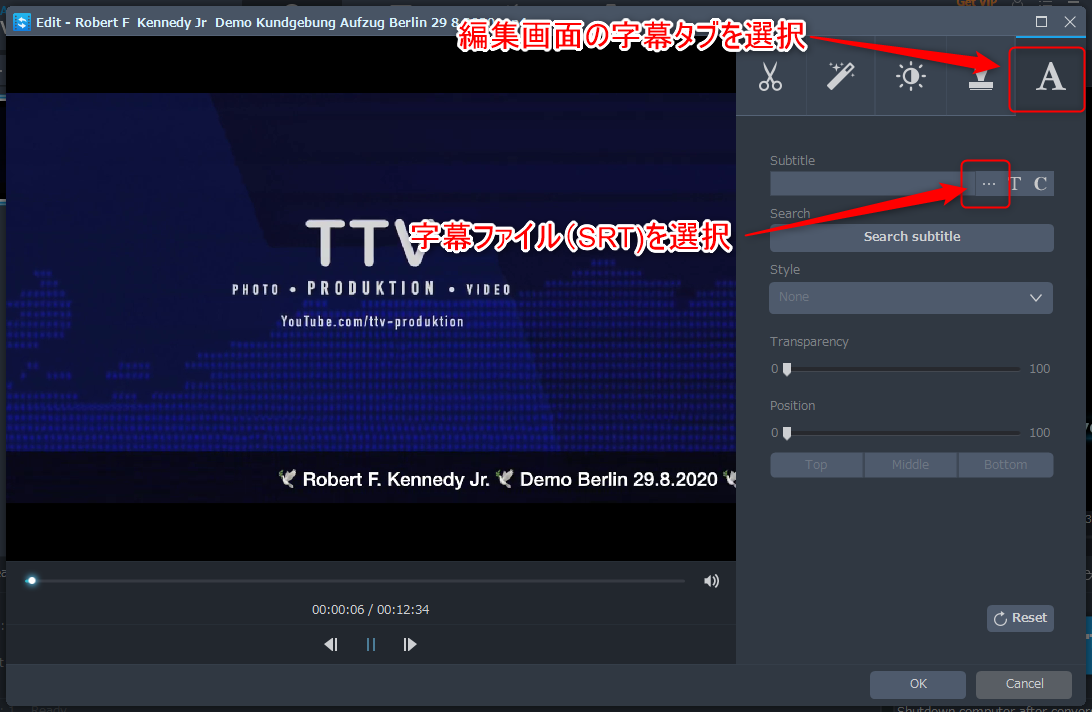編集画面の「A」のタブをクリックして字幕編集に行き、字幕ファイルを選択します。