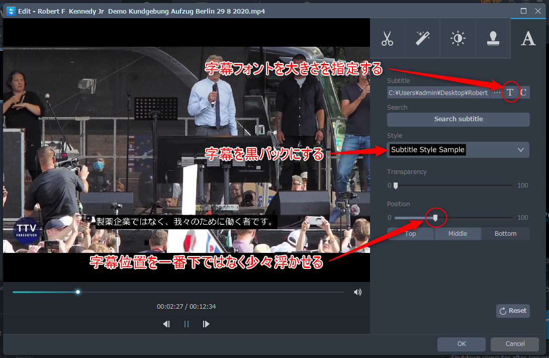 ここで指定するフォント大きさと、最初に行ったSRTの加工(何文字で強制改行するか)が関係してきます。当然ですが、フォントを大きくする場合には、一行がより短い文字数でないといけません。