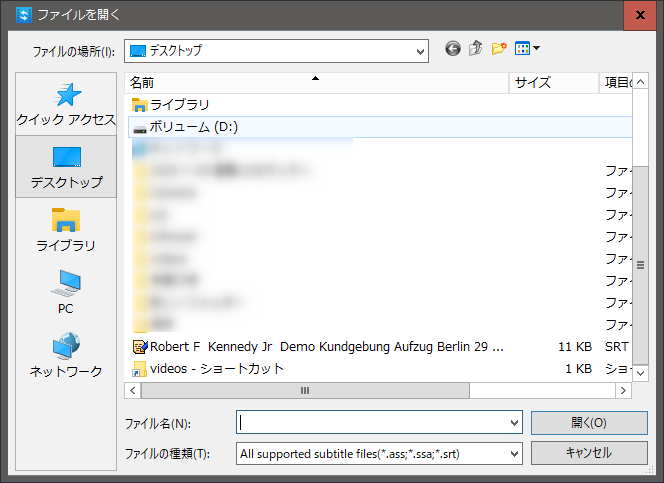 なぜか字幕ファイルのドロップができないので、このダイアログで選択する必要があります。