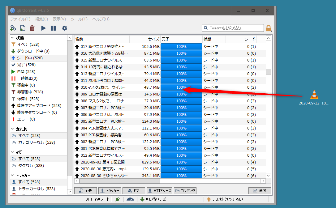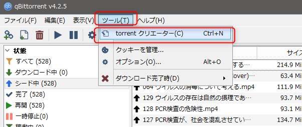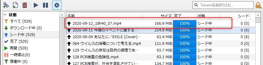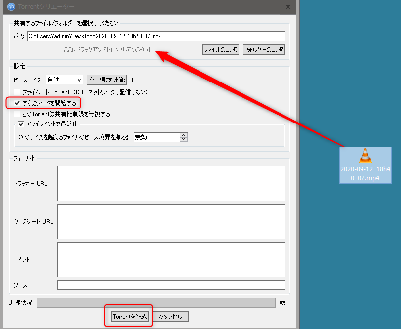 - このmp4ファイルに対応するtorrentファイルを作成する。それと同時にシードを開始する、つまり、誰かが取りに来たらアップロード可能な状態になる。