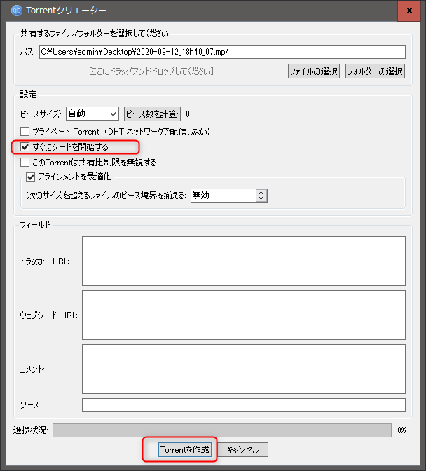 以下のダイアログが表示されるので、「すぐにシードを開始する」をチェックし、「Torrentを作成」です。