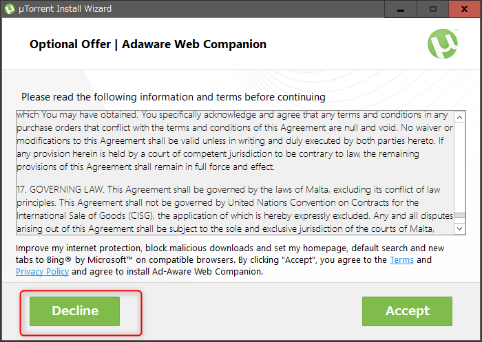 途中で余計なソフトのインストールを促されることがあります。以下が出た場合には、いらないので「Decline」