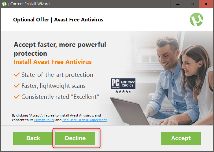 Avastは絶対にインストールしない方が良いと個人的には思います。「Decline」