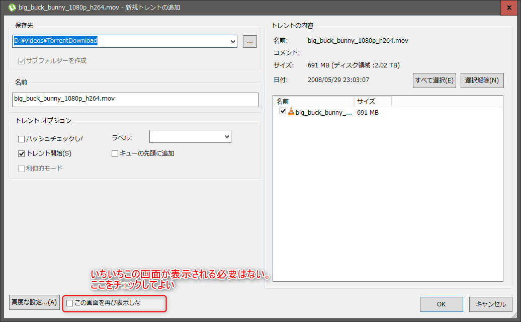 「この画面を再び表示しな」(笑)にチェックした場合には、一度に複数のtorrentファイルをドロップしてダウンロード登録が簡単にできます(そうでないと、いちいちダイアログが出て面倒)。