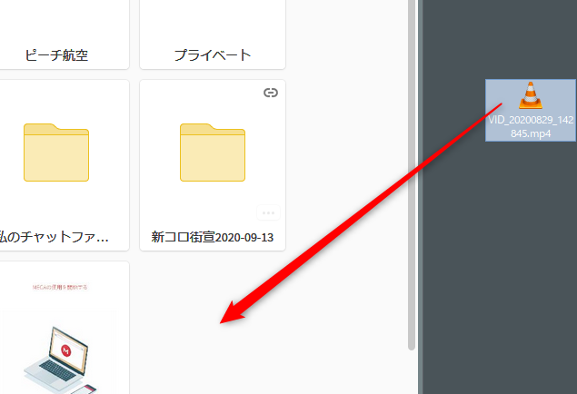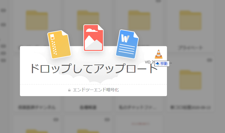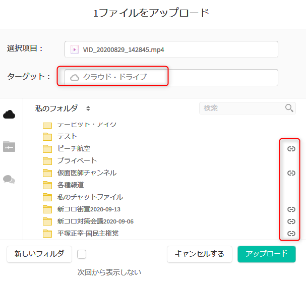 すると、どのフォルダにドロップするのか聞いてきます。「クラウド・ドライブ」を選ぶとトップ。いずからのフォルダを選ぶとそのフォルダの中にドロップされます。ここではトップを選択しています。