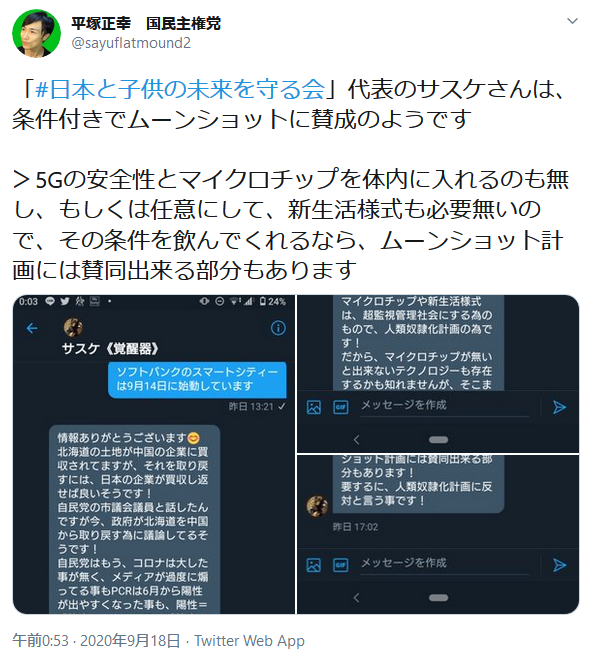 その後のデモの数日前に、平塚が「代表者のサスケという人間は、条件付きでムーンショットに賛成しているぞ」という書き込みをしていました。