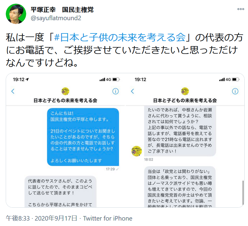 「日本と子どもの未来を考える会」ひつき氏から平塚氏への謝罪