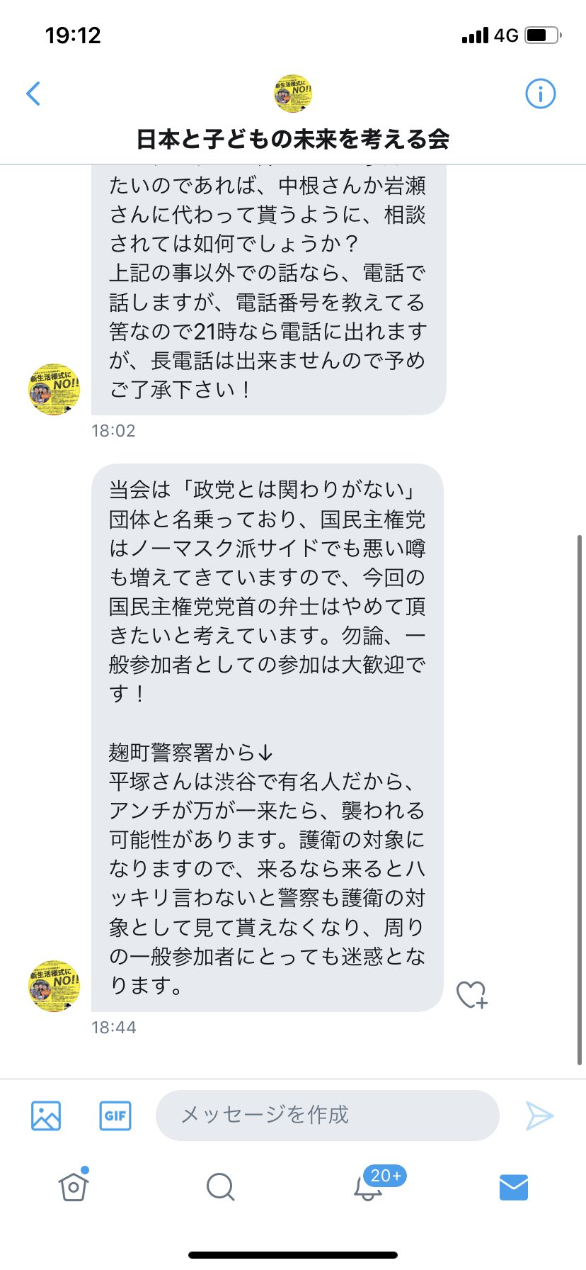 ニコミ会による9/21の国会議事堂前デモの4日前、17日のこと。平塚氏がニコミ会に送ったDMとその返答は以下でした。