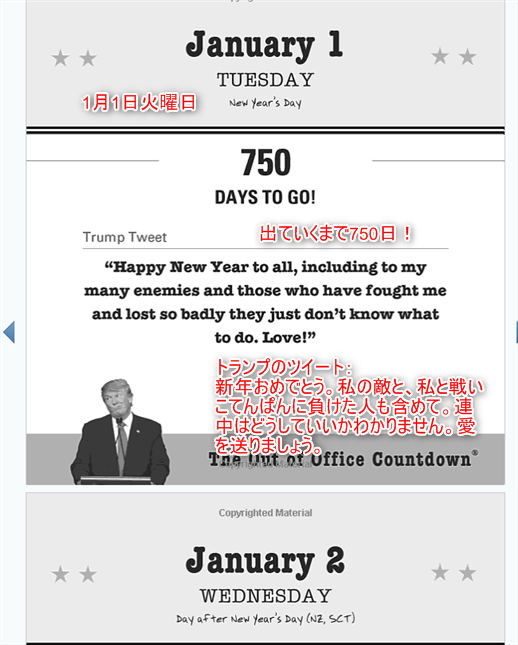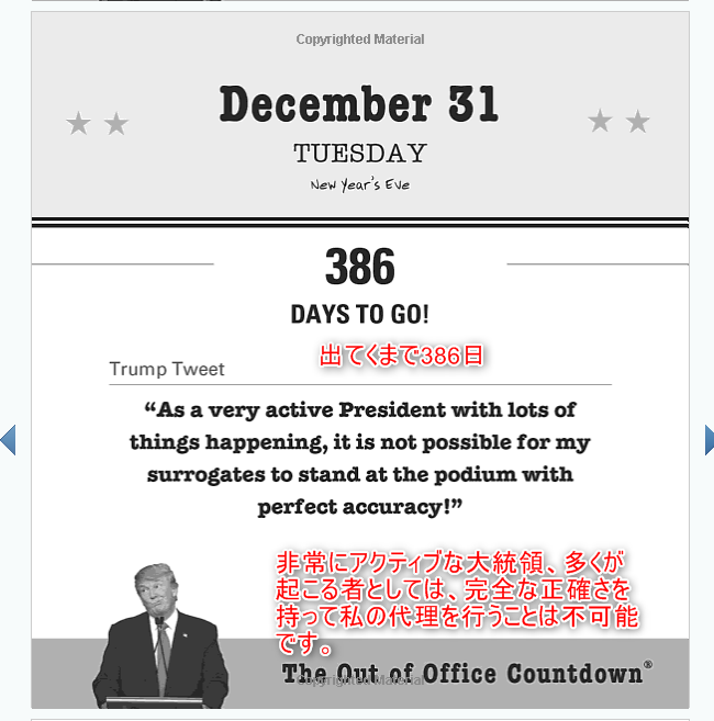 毎日トランプの言葉を楽しみながら、一日一日出ていくのを待ち望むという、そのようなカレンダーとなっております。一体誰がこんなものを買うのかわかりません。