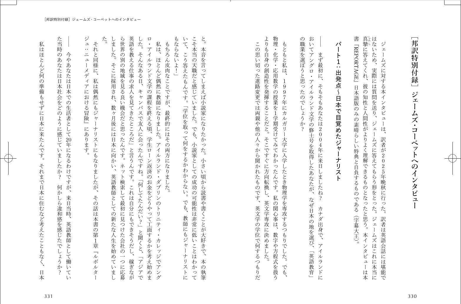 『ジェームズ・コーベット/まだ誰も気づいていない【認知戦争・認知支配】の全貌』[邦訳版特典『ジェームズへのインタビュー』について 2026.04.05 邦訳版のみの特典として『ジェームズ・コーベットへのインタビュー』を掲載しています。全26ページ。 パート1:出発点〜日本で目覚めたジャーナリスト パート2:ジャーナリズムと真実の問題 パート3:教育、メディアリテラシー、そしてテクノロジーの役割 パート4:哲学、人間の自由、そして自由に生きることの意味 以下は本インタビューの1,2ページ目です。