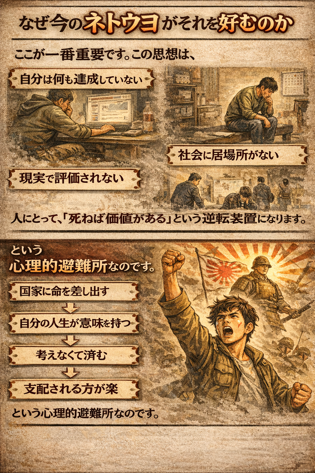 「国のために死ね」は国家が人を使い捨てるための思想。日本ではそれが美徳・伝統・精神論に偽装された。ネトウヨはそれを“誇り”だと錯覚させてくれる物語に依存している。健全な国家とは