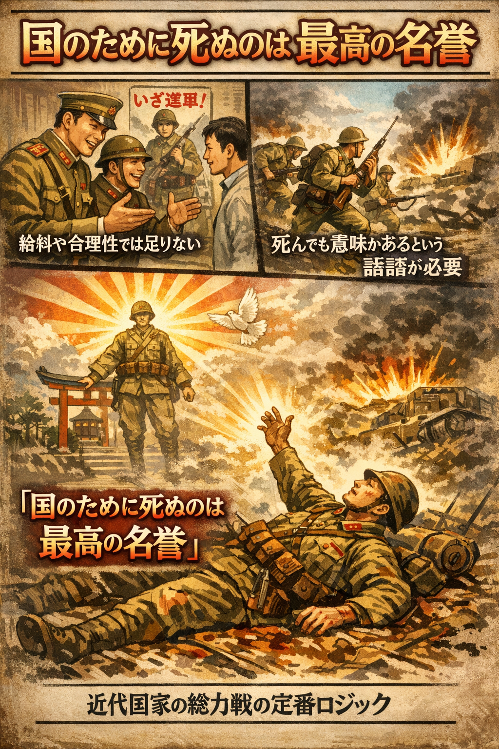 そこで使われたのが「国のために死ぬのは最高の名誉」という価値観です。これは日本に限らず、近代国家が総力戦を行うときの定番ロジックです。