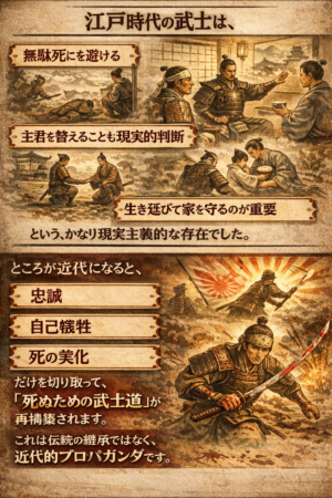 だけを切り取って「死ぬための武士道」が再構築されます。これは伝統の継承ではなく、近代的プロパガンダです。