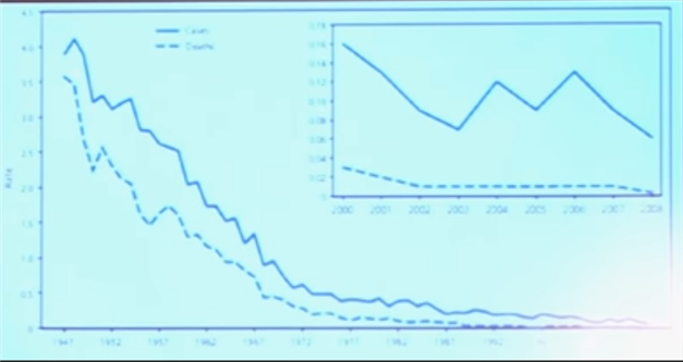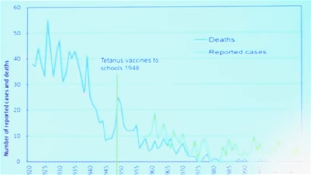 OK。では、破傷風に戻りましょう。我々は良く言われますね、このワクチンを接種すれば、死亡率も病気例としてもぐんと減ると。このグラフを見せられるわけですが、まさにそう見えますね、破傷風ワクチンがこのあたりで現れ、スキー滑降のように下がるわけです。