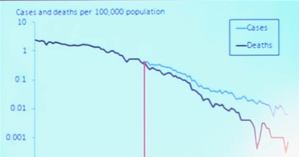 病気例と死亡率はこのように下がっており、ワクチンはここで現れます(赤矢印の時点)。実際には少しあがってますね、ワクチンが登場すると。