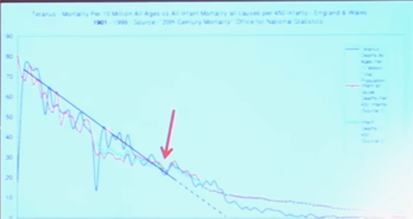 破傷風による死亡率なんですが、この時点から報告が始まり、しかし死亡率というのは、急激に下がっています。そしてここがワクチンの現れた年ですが、奇妙な理由により若干増加します。