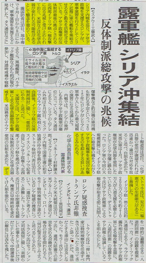 アサド政権が、最後の「反体制派」拠点のイドリブに総攻撃に出るということで、ロシアが軍事力を集結させています。米国は化学兵器が使われると予想しています。ロシア軍の展開は、アサド政権軍を米国が攻撃するのを抑止する狙いがある、とのことです。