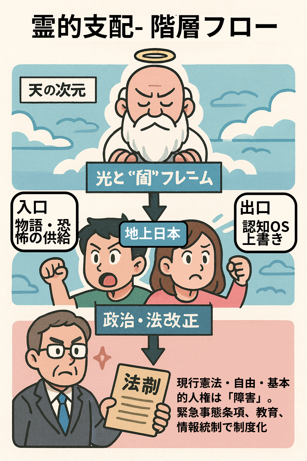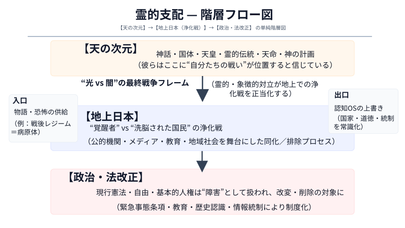| 天上レイヤー | 光の軍(愛国・神・伝統・家族・天皇・神話) vs 闇の軍(グローバリズム・共産・LGBT・AI・悪魔・メディア)という“霊的戦争”が進行中 |