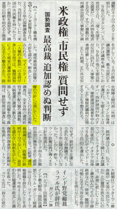 10年に一度の米国国勢調査があるわけなんですが、その質問項目として「ところであんた市民権持ってるの?(米国国民なの?)」を、トランプ政権が復活させようとしていたわけなんですが、最高裁に「駄目」と言われてしまったわけです。