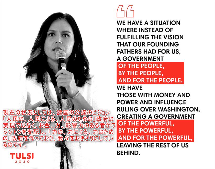 いつも見るのは、両党の人々は、中傷に頼るか、あるいは表面的な攻撃です。なぜなら、この議論に参加することを拒否するからです。つまり、なぜ彼らが体制変更戦争を推進し、起こすのかという点です、悲劇的な結果を無視してですね、それらの国々の人々においての。そして米国民もです。現実としては、これらの戦争では、血税を数兆ドル使うのです。そのお金はここにあるべきです。我々のポケットにあるべきなんです。そして、投資するんです、我々の倒壊中のインフラとか。