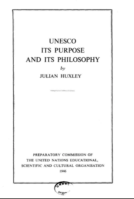 ユネスコが設立された当時の初代事務局長はジュリアン・ハクスリー(Julian Huxley)です。彼は書籍『素晴らしい新世界』で有名なオルダス・ハクスリーの兄であり、優生学の信奉者でした。彼は初代事務局長として、1946年に「ユネスコ:その目的と哲学(”UNESCO: Its Purpose and Its Philosophy”)」を出しています。これは、ユネスコ創設時の理念的指針(設立趣意書)として初代事務局長個人の名前で出されたものです。