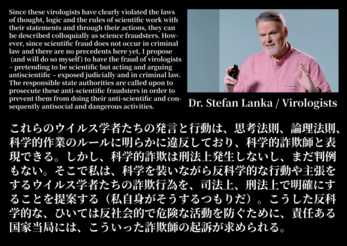 こういったインチキを平気で行っているウイルス学者はもはや犯罪者と言えます。ウイルス学のインチキぶりに気づき、ウイルス学者の名前を返上したステファン・ランカは次のように言います。