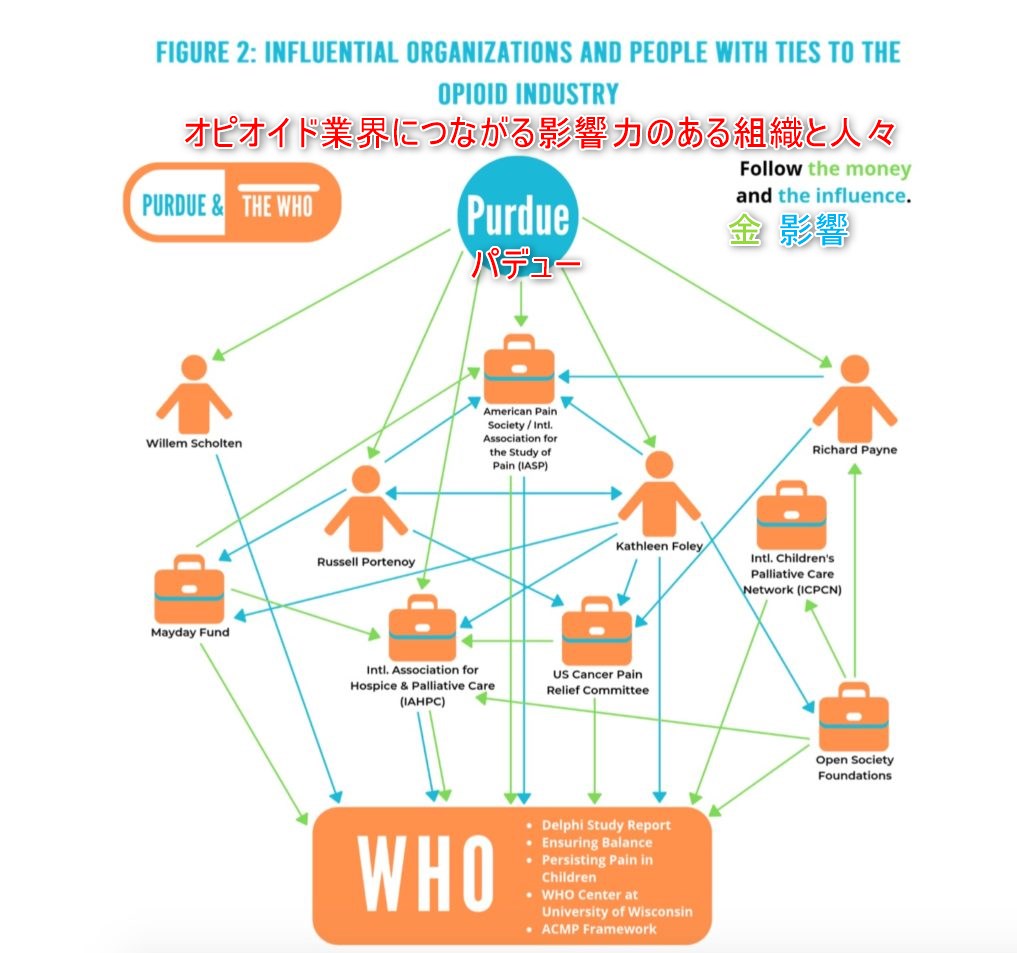 WHOが沈黙していたのは、1999年以降、 患者支援団体を通じて大手製薬会社から資金提供を受け、 大手製薬会社と提携している団体の意見をガイドラインに反映させていたため、 報告書にオピオイド業界寄りのバイアスがかかっていたからです。