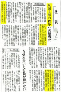 そもそも、何度か書きましたが、米国主導の(世界)秩序とは何でしょうか?読売はよっぽどこの言葉がお好みのようで、何度も繰り返しますが、誰がそんなもの認めたのでしょう?何の根拠もなく、合意もなく、あたかも当然のように勝手に使ってますね。