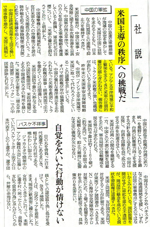 以前にも最悪の思考停止状態。誰も北朝鮮の理由がわからない2で書きました。これを読んでもらえばわかるんですが、「マティスが『中国が米国主導の世界秩序に挑戦している』という演説をした」というのは、「中国が力づくで奪おうとしてる」以外に解釈しようがありません。今回の社説でもそういうことですよね。国連決議も投票も世界人民の意思も無いわけです。
